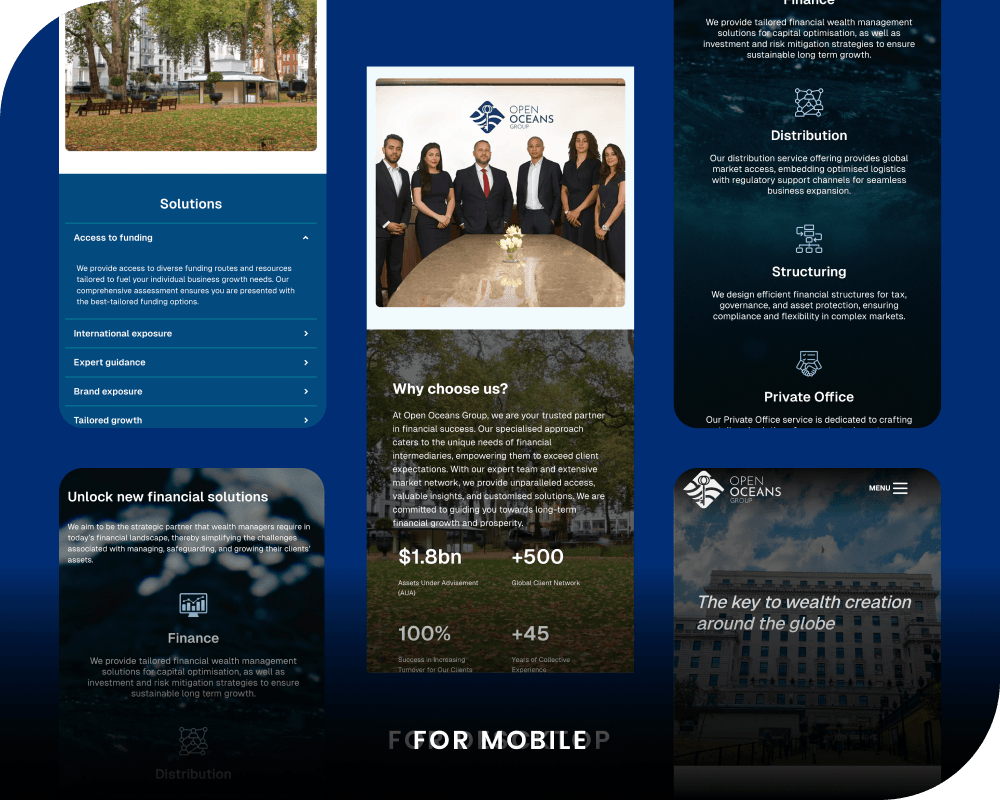Open Oceans Group confronted the challenge of advancing their digital standing without undermining their established brand equity, requiring thoughtful development rather than disruptive change. The firm needed a sophisticated digital platform appropriately engaging their high-net-worth clientele whilst sustaining the credibility and assurance inherent to their sector. The project demanded equilibrium between brand progression and client retention, ensuring that established relationships flourished with the updated identity whilst prospective high-net-worth clients were attracted to the refreshed digital experience.